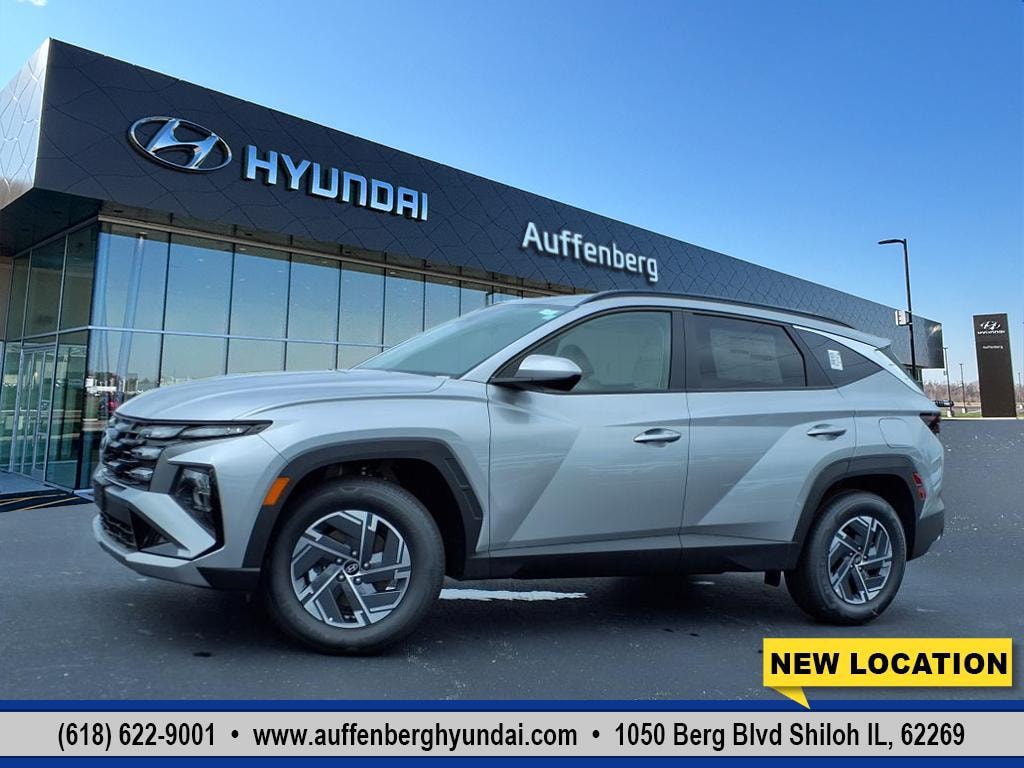 Shimmering Silver 2025 Hyundai Tucson Hybrid Blue 4D Sport Utility 1.6L I4 DGI Hybrid Turbocharged DOHC 16V LEV3-SULEV30 AWD 6-Speed Automatic 1.6L I4 DGI Hybrid Turbocharged DOHC 16V LEV3-SULEV30, 17" Alloy Wheels, 4-Wheel Disc Brakes, 6 Speakers, ABS brakes, Air Conditioning, Alloy wheels, AM/FM radio: SiriusXM, Apple CarPlay & Android Auto, Auto High-beam Headlights, Automatic temperature control, Brake assist, Bumpers: body-color, Cargo Net, Carpeted Floor Mats, Delay-off headlights, Driver door bin, Driver vanity mirror, Dual front impact airbags, Dual front side impact airbags, Electronic Stability Control, Emergency communication system: Bluelink+, Four wheel independent suspension, Front anti-roll bar, Front Bucket Seats, Front Center Armrest, Front dual zone A/C, Front reading lights, Fully automatic headlights, Heated door mirrors, Heated Front Bucket Seats, Heated front seats, Illuminated entry, Low tire pressure warning, Occupant sensing airbag, Option Group 01, Outside temperature display, Overhead airbag, Overhead console, Panic alarm, Passenger door bin, Passenger vanity mirror, Power door mirrors, Power driver seat, Power Liftgate, Power steering, Power windows, Radio data system, Radio: AM/FM/HD Audio System, Rear anti-roll bar, Rear reading lights, Rear seat center armrest, Rear side impact airbag, Rear window defroster, Rear window wiper, Remote keyless entry, Security system, Speed control, Split folding rear seat, Spoiler, Stain & Odor Resistant Cloth Seat Trim, Steering wheel mounted audio controls, Tachometer, Telescoping steering wheel, Tilt steering wheel, Traction control, Trip computer, Variably intermittent wipers, 1.6L I4 DGI Hybrid Turbocharged DOHC 16V LEV3-SULEV30.