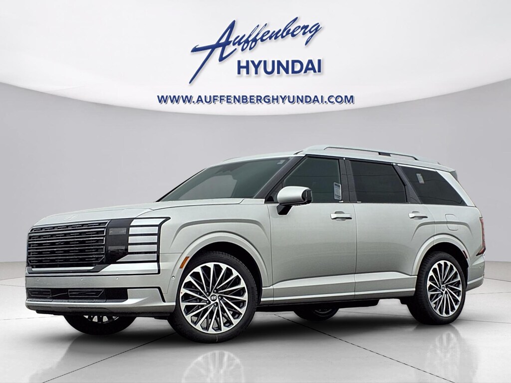 Typhoon Silver Metallic 2026 Hyundai Palisade Hybrid Calligraphy 4D Sport Utility 2.5L Turbocharged GDI 4-Cylinder Hybrid AWD 6-Speed Automatic 2.5L Turbocharged GDI 4-Cylinder Hybrid, 14 Speakers, 3rd row seats: split-bench, 4-Wheel Disc Brakes, ABS brakes, Air Conditioning, Alloy wheels, AM/FM radio: SiriusXM, Apple CarPlay & Android Auto, Audio memory, Auto High-beam Headlights, Auto-dimming door mirrors, Auto-dimming Rear-View mirror, Auto-leveling suspension, Automatic temperature control, Brake assist, Bumpers: body-color, Cargo Cover, Cargo Organizer, Cargo Tray, Carpeted Floor Mats, Compass, Delay-off headlights, Driver door bin, Driver vanity mirror, Dual front impact airbags, Dual front side impact airbags, Electronic Stability Control, Emergency communication system: None, Exterior Parking Camera Rear, First Aid Kit, Four wheel independent suspension, Front anti-roll bar, Front Bucket Seats, Front Center Armrest, Front dual zone A/C, Front reading lights, Fully automatic headlights, Garage door transmitter: HomeLink, Genuine wood console insert, Genuine wood dashboard insert, Heads-Up Display, Heated and Ventilated Front Bucket Seats, Heated door mirrors, Heated front seats, Heated rear seats, Heated steering wheel, HVAC memory, Illuminated entry, Knee airbag, Leather steering wheel, Low tire pressure warning, Memory seat, Navigation System, Occupant sensing airbag, Option Group 01, Outside temperature display, Overhead airbag, Overhead console, Panic alarm, Passenger door bin, Passenger vanity mirror, Power door mirrors, Power driver seat, Power Liftgate, Power moonroof, Power passenger seat, Power steering, Power windows, Premium Nappa Leather Seat Trim, Radio data system, Radio: Infotainment Navigation System, Rain sensing wipers, Rear air conditioning, Rear anti-roll bar, Rear audio controls, Rear reading lights, Rear side impact airbag, Rear window defroster, Rear window wiper, Reclining 3rd row seat, Remote keyless entry, Security system, Speed control, Split folding rear seat, Spoiler, Steering wheel mounted audio controls, Tachometer, Telescoping steering wheel, Tilt steering wheel, Traction control, Trip computer, Turn signal indicator mirrors, Variably intermittent wipers, Ventilated front seats, Ventilated rear seats, Wheels: 21" x 8.5J Alloy, 2.5L Turbocharged GDI 4-Cylinder Hybrid.