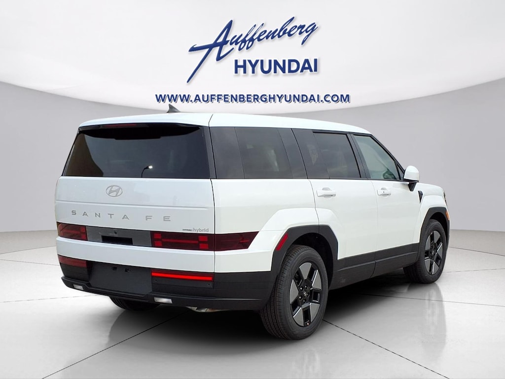 Serenity White 2026 Hyundai Santa Fe Hybrid SE 4D Sport Utility I4 AWD 6-Speed Automatic with Shiftronic I4, 18" x 7.5J Alloy Wheels, 3rd row seats: bench, 4-Wheel Disc Brakes, 6 Speakers, ABS brakes, Air Conditioning, Alloy wheels, AM/FM radio: SiriusXM, Apple CarPlay & Android Auto, Auto High-beam Headlights, Automatic temperature control, Brake assist, Bumpers: body-color, Carpeted Floor Mats, Delay-off headlights, Driver door bin, Driver vanity mirror, Dual front impact airbags, Dual front side impact airbags, Electronic Stability Control, Emergency communication system, Exterior Parking Camera Rear, Four wheel independent suspension, Front anti-roll bar, Front Bucket Seats, Front Center Armrest, Front dual zone A/C, Front reading lights, Fully automatic headlights, Heated door mirrors, Illuminated entry, Knee airbag, Leather steering wheel, Low tire pressure warning, Occupant sensing airbag, Option Group 01, Outside temperature display, Overhead airbag, Overhead console, Panic alarm, Passenger door bin, Passenger vanity mirror, Power door mirrors, Power Liftgate, Power steering, Power windows, Radio: AM/FM/HD Display Audio, Rear anti-roll bar, Rear seat center armrest, Rear side impact airbag, Rear window defroster, Rear window wiper, Remote keyless entry, Security system, Speed control, Speed-sensing steering, Split folding rear seat, Spoiler, Steering wheel mounted audio controls, Tachometer, Telescoping steering wheel, Tilt steering wheel, Traction control, Trip computer, Variably intermittent wipers, YES Essentials Stain-Resistant Cloth Seat Trim, I4.