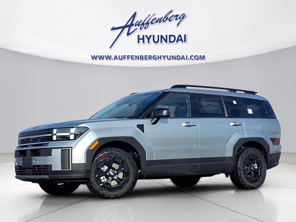 Shimmering Silver 2026 Hyundai Santa Fe XRT 4D Sport Utility 2.5L I4 AWD 8-Speed Automatic with SHIFTRONIC AWD, Black Premium Synthetic, 3rd row seats: bench, 4-Wheel Disc Brakes, 6 Speakers, ABS brakes, Air Conditioning, Alloy wheels, AM/FM radio: SiriusXM, Apple CarPlay & Android Auto, Auto High-beam Headlights, Automatic temperature control, Brake assist, Bumpers: body-color, Cargo Cover/Screen, Cargo Net, Cargo Tray, Carpeted Floor Mats, Delay-off headlights, Driver door bin, Driver vanity mirror, Dual front impact airbags, Dual front side impact airbags, Electronic Stability Control, Emergency communication system, Exterior Parking Camera Rear, First Aid Kit, Four wheel independent suspension, Front anti-roll bar, Front Bucket Seats, Front Center Armrest, Front dual zone A/C, Front reading lights, Fully automatic headlights, H-Tex Leatherette Seat Trim, Heated door mirrors, Heated Front Bucket Seats, Heated front seats, Illuminated entry, Knee airbag, Leather steering wheel, Low tire pressure warning, Navigation System, Occupant sensing airbag, Option Group 01, Outside temperature display, Overhead airbag, Overhead console, Panic alarm, Passenger door bin, Passenger vanity mirror, Power door mirrors, Power driver seat, Power Liftgate, Power moonroof, Power steering, Power windows, Radio: AM/FM/HD Display Audio, Rear anti-roll bar, Rear seat center armrest, Rear side impact airbag, Rear window defroster, Rear window wiper, Remote keyless entry, Roof Rack Crossbars, Security system, Speed control, Speed-sensing steering, Split folding rear seat, Spoiler, Steering wheel mounted audio controls, Tachometer, Telescoping steering wheel, Tilt steering wheel, Traction control, Trip computer, Turn signal indicator mirrors, Variably intermittent wipers, Wheels: 18" x 7.5J Dark Alloy, AWD, Black Premium Synthetic.