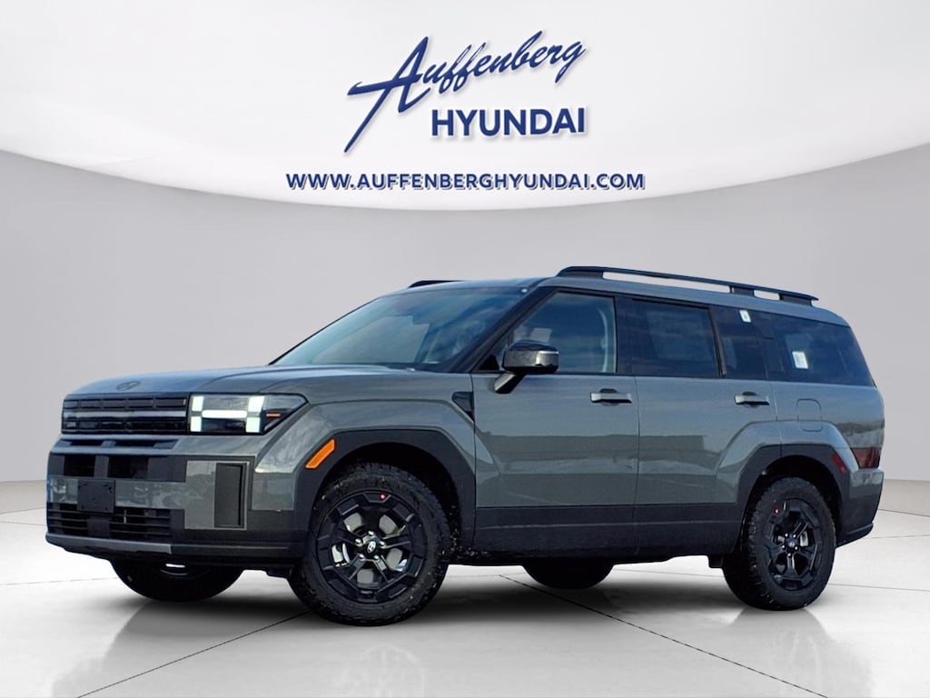 Hampton Gray 2026 Hyundai Santa Fe XRT 4D Sport Utility 2.5L I4 AWD 8-Speed Automatic with SHIFTRONIC AWD, Black Premium Synthetic, 3rd row seats: bench, 4-Wheel Disc Brakes, 6 Speakers, ABS brakes, Air Conditioning, Alloy wheels, AM/FM radio: SiriusXM, Apple CarPlay & Android Auto, Auto High-beam Headlights, Automatic temperature control, Brake assist, Bumpers: body-color, Cargo Net, Cargo Tray, Carpeted Floor Mats, Delay-off headlights, Driver door bin, Driver vanity mirror, Dual front impact airbags, Dual front side impact airbags, Electronic Stability Control, Emergency communication system, Exterior Parking Camera Rear, First Aid Kit, Four wheel independent suspension, Front anti-roll bar, Front Bucket Seats, Front Center Armrest, Front dual zone A/C, Front reading lights, Fully automatic headlights, H-Tex Leatherette Seat Trim, Heated door mirrors, Heated Front Bucket Seats, Heated front seats, Illuminated entry, Knee airbag, Leather steering wheel, Low tire pressure warning, Navigation System, Occupant sensing airbag, Option Group 01, Outside temperature display, Overhead airbag, Overhead console, Panic alarm, Passenger door bin, Passenger vanity mirror, Power door mirrors, Power driver seat, Power Liftgate, Power moonroof, Power steering, Power windows, Radio: AM/FM/HD Display Audio, Rear anti-roll bar, Rear seat center armrest, Rear side impact airbag, Rear window defroster, Rear window wiper, Remote keyless entry, Roof Rack Crossbars, Security system, Speed control, Speed-sensing steering, Split folding rear seat, Spoiler, Steering wheel mounted audio controls, Tachometer, Telescoping steering wheel, Tilt steering wheel, Traction control, Trip computer, Turn signal indicator mirrors, Variably intermittent wipers, Wheels: 18" x 7.5J Dark Alloy, AWD, Black Premium Synthetic.